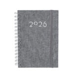 Agenda de anillas tamaño A5 fabricada en suave poliéster RPET. Con tapas rígidas y cierre de goma elástica a juego. Incluye caja kraft de presentación. Cuenta con distintivo RPET.Diseño página día, zona de anotaciones y marcapáginas de tela. En 2 idiomas: castellano e inglés. El material RPET se elabora a partir de plástico reciclado, para así fomentar la reutilización de residuos plásticos y ayudar a la sostenibilidad del planeta.