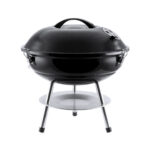 Barbacoa fabricada en resistente acero al carbono de acabado en negro. Tapa con cómoda asa y orificios de ventilación, con parrilla metálica, plato antigoteo y pies antideslizantes. Presentada en atractiva caja de diseño.