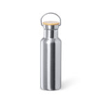 Bidón térmico de 500 ml de capacidad, fabricado en acero inox de doble pared y acabado mate. Incluye original tapón a rosca en acero inox, con detalle de bambú y asa integrada. Libre de BPA y presentado en caja individual de diseño kraft.