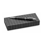 Elegante bolígrafo de mecanismo giratorio en sobrio diseño bicolor. De cuerpo metálico en suave acabado con accesorios en colores plateados. Presentado en elegante estuche individual en color negro con cierre de imán. De cartucho jumbo, con recambio incluido y en tinta azul.