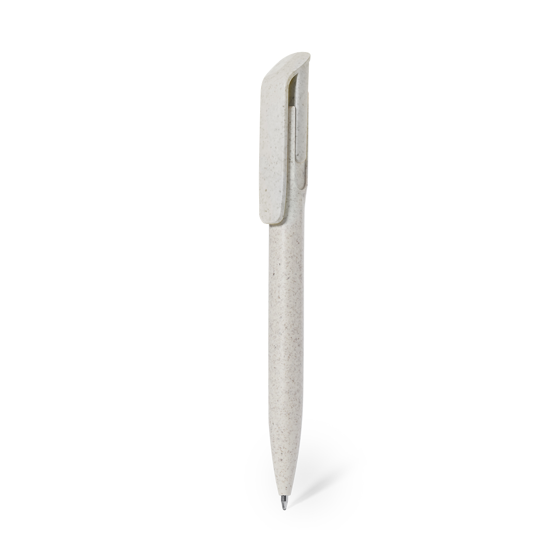 Práctico bolígrafo fabricado en caña de trigo. De mecanismo pulsador, en tinta azul y con logotipo Wheat Straw en la parte superior del bolígrafo. Con clip en variada gama de colores y cuerpo natural. La caña de trigo fomenta la utilización de materias primas naturales, reduciendo así las emisiones contaminantes.