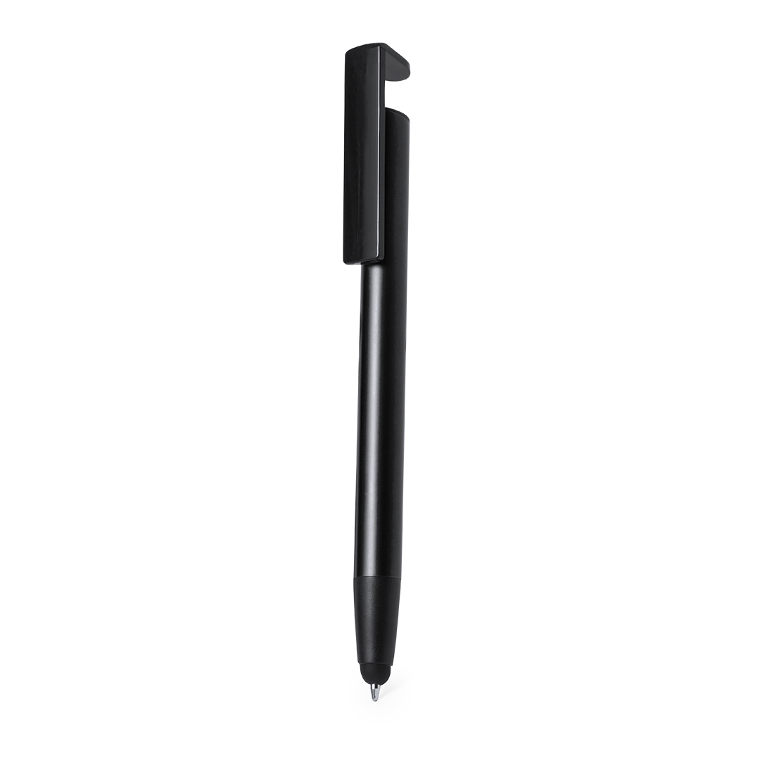 Bolígrafo puntero de mecanismo pulsador, fabricado en resistente aluminio. Con soporte para dispositivo móvil integrado en clip y suave cuerpo en variada gama de colores metalizados. En tinta azul y presentado individualmente en bolsa reciclada.