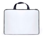 Práctica funda para ordenador portátil de hasta 15 pulgadas en soft shell. Especialmente diseñada para la sublimación con dos caras amplias para el marcaje, de cierre por cremallera de doble tirador en color negro y dos asas. Presentado individualmente en una bolsa reciclada.