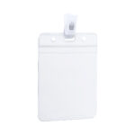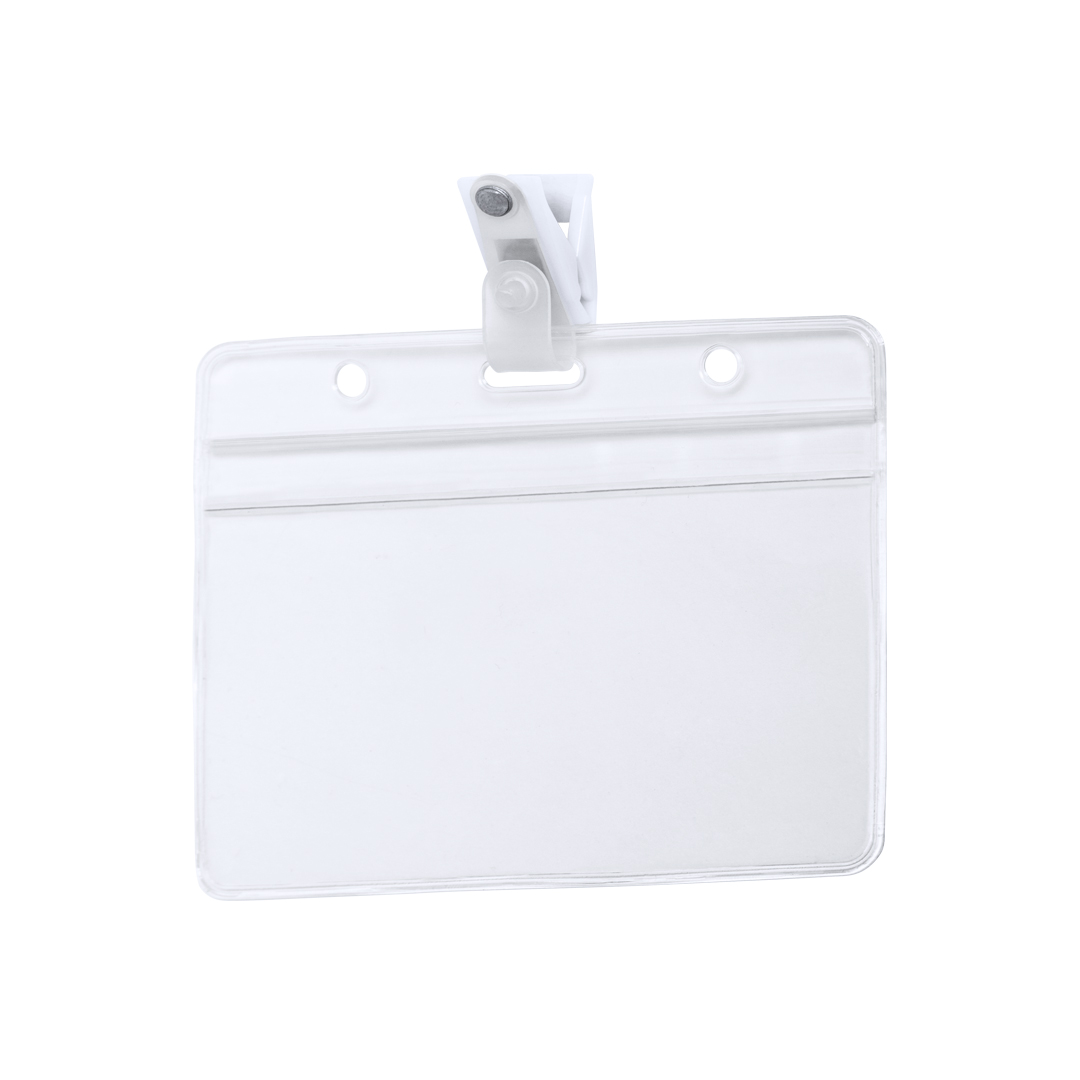 Identificador troquelado en PVC con clip de fijación en color blanco. Disponible en diseño horizontal y vertical.