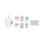 Kit de excursión de 8 accesorios presentado en un estuche en resistente ABS, con práctico mosquetón metálico para un cómodo transporte. Incluye toalla para limpieza de manos, toallita alivia picaduras, protección solar SPF30, after sun, gel hidroalcohólico y vendas.
