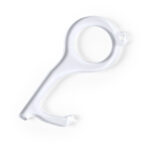 Llavero higiénico anti-contacto, fabricado en original y resistente material acrílico de acabado transparente. Especialmente diseñado para evitar tocar con las manos superficies de uso común (picaportes de puertas, interruptores, grifos de uso público, cajeros automáticos…). Con cómodo troquel para el dedo y presentado en bolsa individual de diseño. Recomendado para marcaje en tampografía.