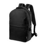 Mochila de negocios en resistente 600D RPET, elaborado a partir de plástico reciclado, para así fomentar la reutilización de residuos plásticos y ayudar a la sostenibilidad del planeta. Con cierre de cremallera de doble tirador y bolsillo en frontal. Interior con bolsillos acolchados para tablet de hasta 10 pulgadas y ordenador portátil de hasta 15 pulgadas, con estación de carga USB (cable incluido, batería auxiliar no incluida). Esquinas reforzadas, asa de transporte acolchada y accesorios en color negro. Espalda y cintas de hombros acolchadas y ajustables. Distintivo RPET en etiqueta.