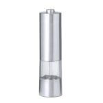 Molinillo eléctrico para sal y pimienta en acero inox. Ideal para agregar la especia más deseada en compartimento de 70 ml, condimentando al pulsar el botón superior pudiendo ajustar el tamaño del grano. Equipado con una ventana para visualizar la cantidad de especia que queda y con luz LED. Alimentado por 4 pilas AAA (no incluidas) y presentada en caja de diseño kraft.