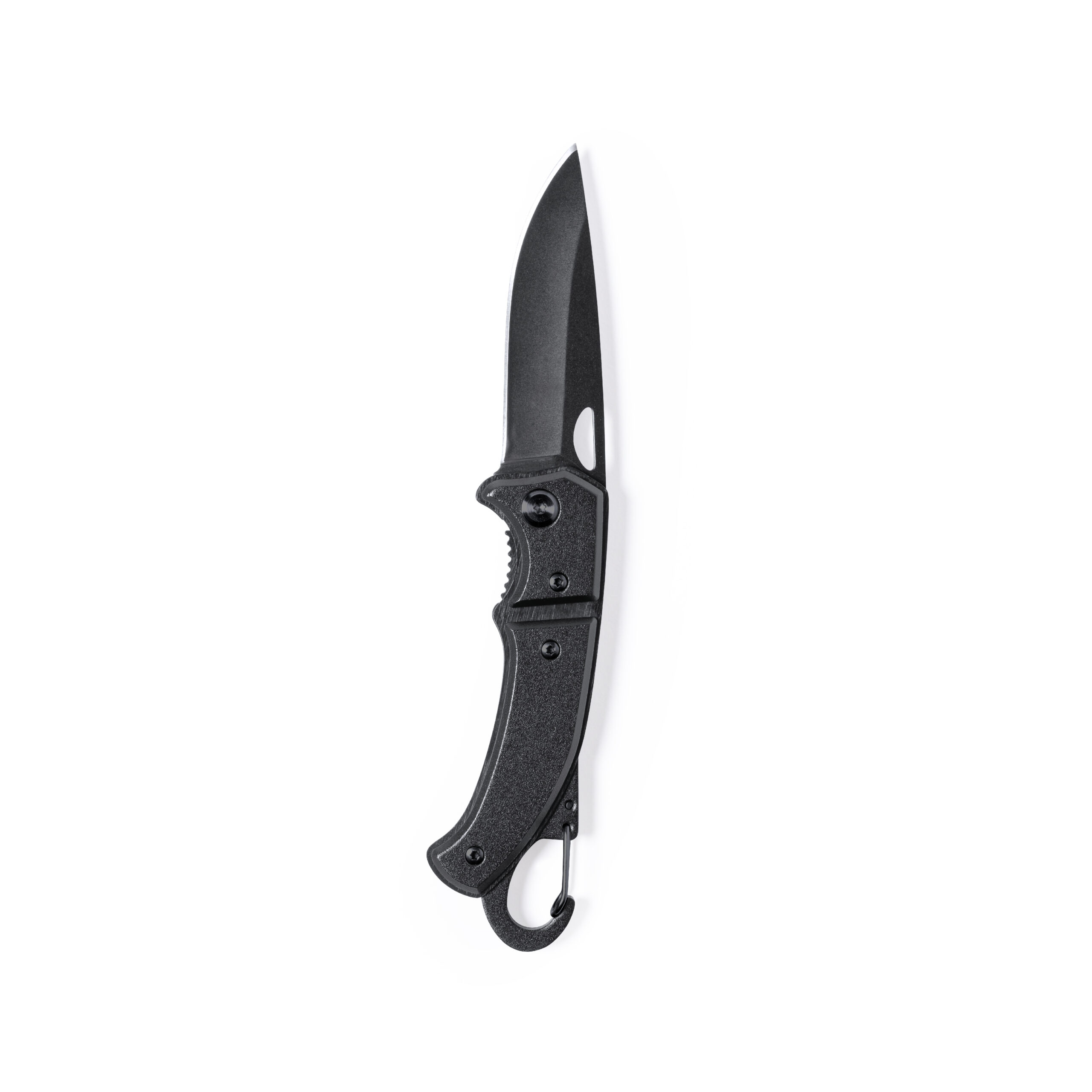 Navaja con hoja en acero inox de acabado negro y resistente empuñadura a juego en aluminio. Con mosquetón integrado en mango y bloqueo de seguridad. Con troquelado en hoja para una fácil apertura y presentada en caja individual de diseño negra.