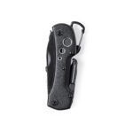 Navaja multiusos con accesorios en acero inox de acabado negro y resistente empuñadura a juego en aluminio, con mosquetón integrado en mango. 13 funciones, entre ellas cuchillo y navaja destornillador, lima abridor y tijeras. Plegable y de tamaño compacto, presentada en caja individual de diseño negra.