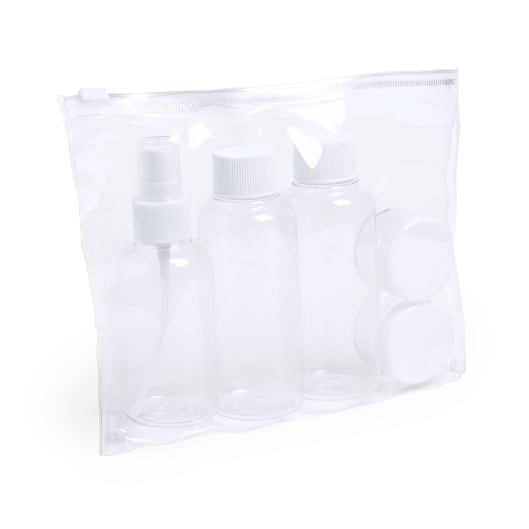 Set neceser de viaje de 5 accesorios en diseño transparente. Incluye dos botes para gel y champú con tapón a rosca, perfumador y dos tarritos para crema. Presentado en estuche de PVC con cierre hermético a juego.