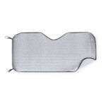 Parasol en aluminio a una cara en color plateado de acabado metalizado con ribetes de poliéster en vivos colores. De tamaño 130x60cm y espuma en el reverso. Cintas elásticas de ajuste con argollas metálicas de refuerzo, dos ventosas para ajuste en luna y presentación desplegado en plancha para fácil impresión.