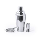 Set cóctel de 3 accesorios, fabricado en acero inox de acabado cromado. Incluye: Cocktelera de 550ml de capacidad, con cierre de seguridad y tapón dosificador en parte superior.Colador con asa.Medidor single/double.
