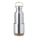 Práctico set de bidón y vaso térmico en acero inox. Incluye, bidón térmico de 500 ml de capacidad fabricado en acero inox, tapón de seguridad a rosca con base de bambú e incluye asa de transporte. Además, contiene 1 vaso de 300 ml de capacidad en acero inox y tapadera bambú con cierre de presión. Presentado en una caja de diseño kraft.