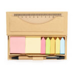 Práctico set de oficina hecho en cartón reciclado. Fácil de transportar gracias a su estuche hecho en cartón reciclado. Contenido: 110 notas adhesivas de 5x5cm en dos colores. 110 mininotas adhesivas en forma de flecha de 1,5x5cm en 5 llamativos colores. Regla de 12cmBolígrafo de cartón reciclado con tinta azul. Set presentado en bolsa individual de papel reciclada. El cartón reciclado proviene del reaprovechamiento de excedente de fabricaciones y reciclaje de papel en el final de su vida útil, convirtiéndose en un lienzo ecológico y sostenible.